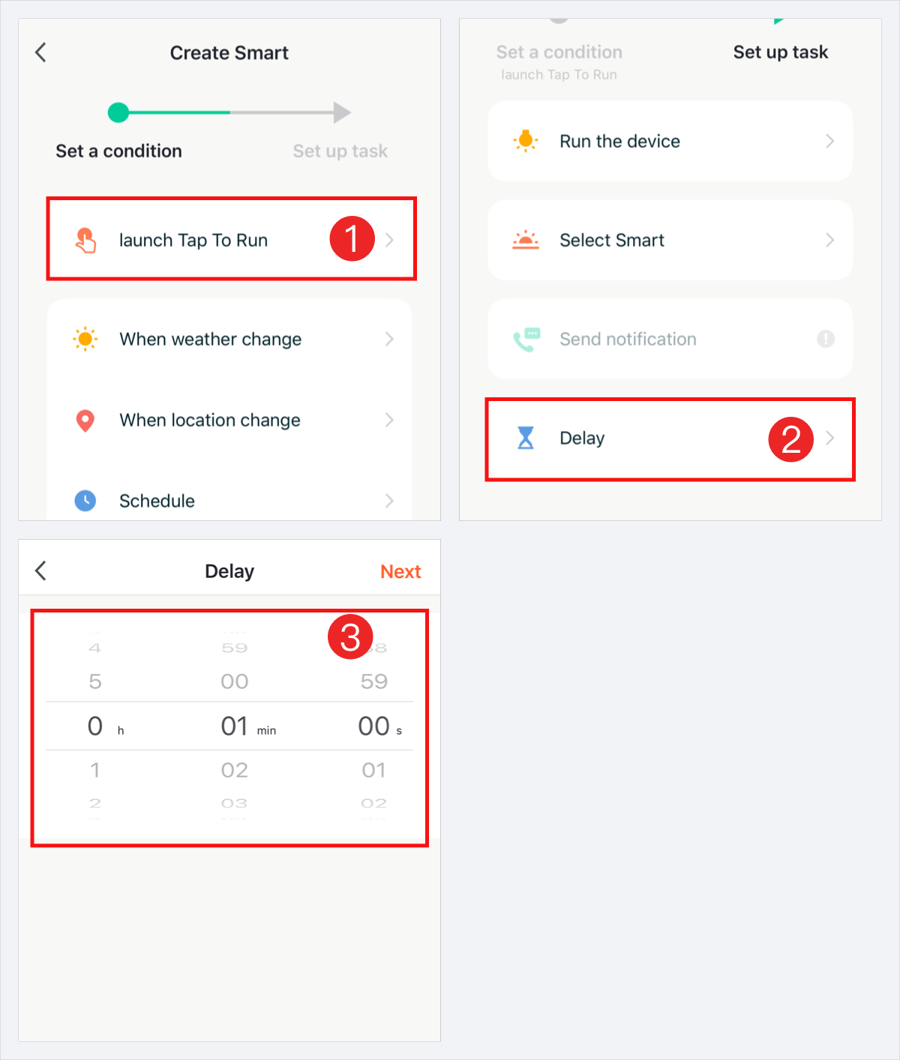 When the location changes: The linkage between the geographic location and the device.For example, you can set ‘turn on the air conditioner and water heater automatically when you are near the house, or turn off all home Appliances and turn on motion detection function of the camera when you leave the house.’
